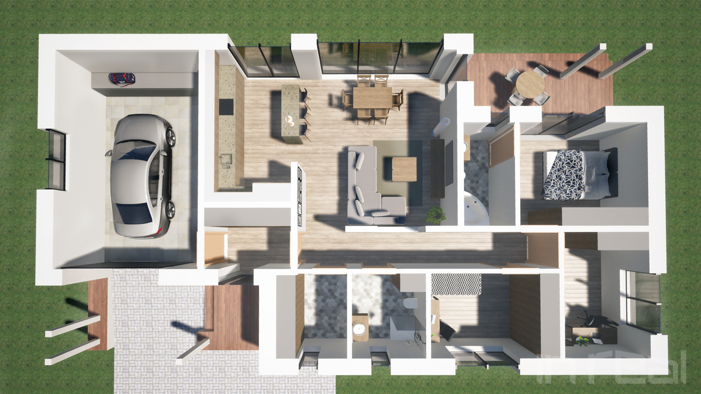 * namo lauko apdaila bus atlikta pilna, vidaus patalpų pilna dalinė apdaila – išbetonuotos grindys, ištinkuotos sienos, išvedžioti visi vidaus inžinieriniai tinklai, apšiltintos lubos, išvedžiota rekuperacijos sistema, sumontuotas gipso kartono plokštės